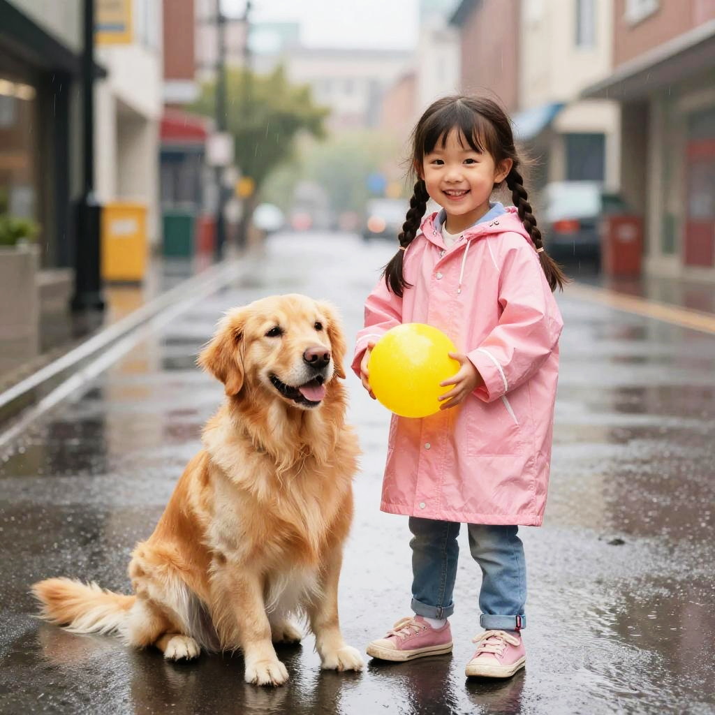 Photograph of a young Asian girl with black braided hair, wearing a pink raincoat, blue jeans, and pink sneakers, standing on a wet urban street. She holds a yellow balloon and smiles. Beside her sits a golden retriever with a wagging tail and a happy expression. The background shows blurred storefronts, a street lamp, and a distant white vehicle. The street's wet surface reflects the light, and potted plants are visible on the right. The overall scene is bright with a slightly overcast sky.