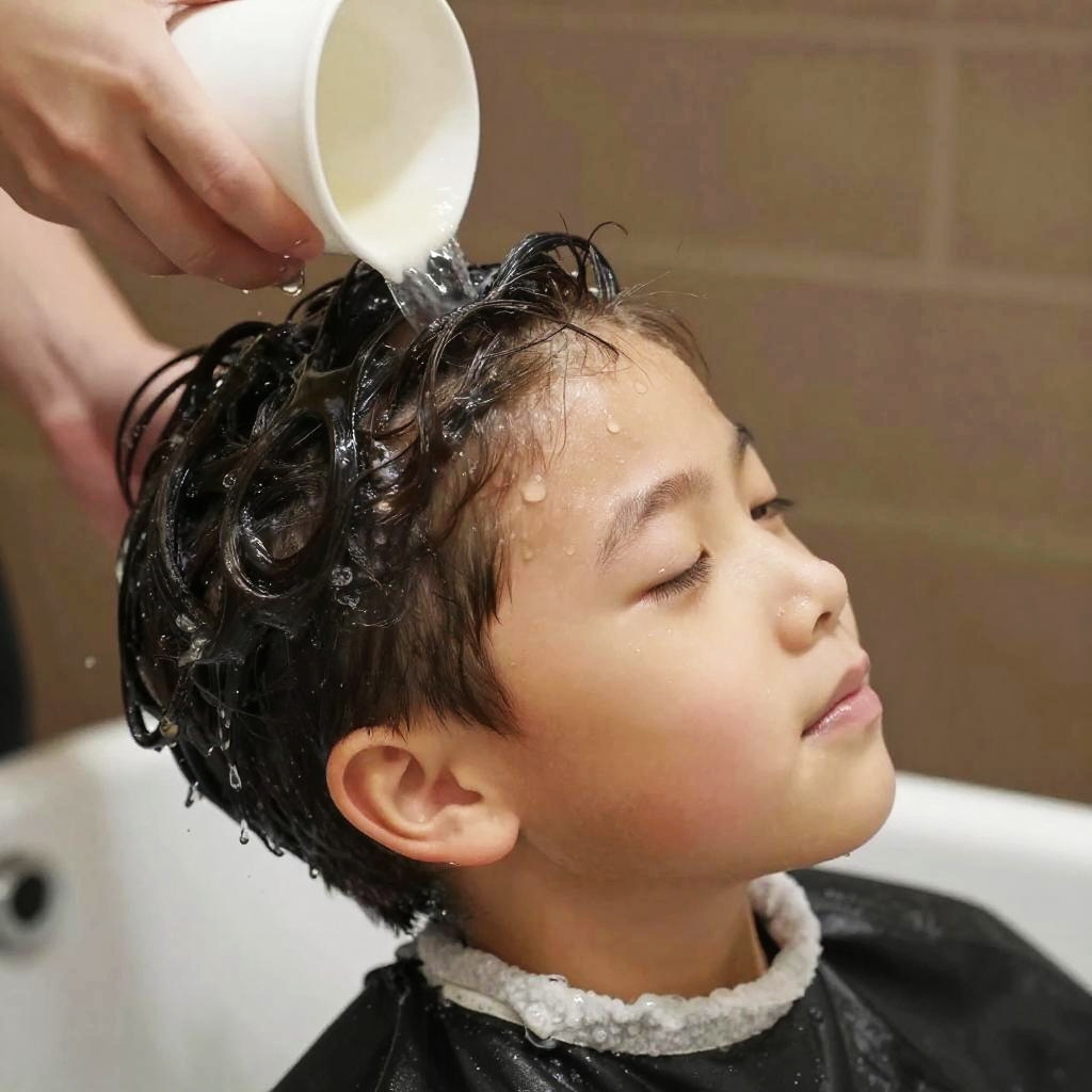 A photograph of a young boy with fair skin and short brown hair, getting his hair washed. A hand with light skin, partially visible, holds a white cup over his head, pouring water. He wears a black shirt with a gray collar, and his expression is relaxed. The background is a warm, textured brown. The image has a soft, slightly overexposed, and vibrant filter.