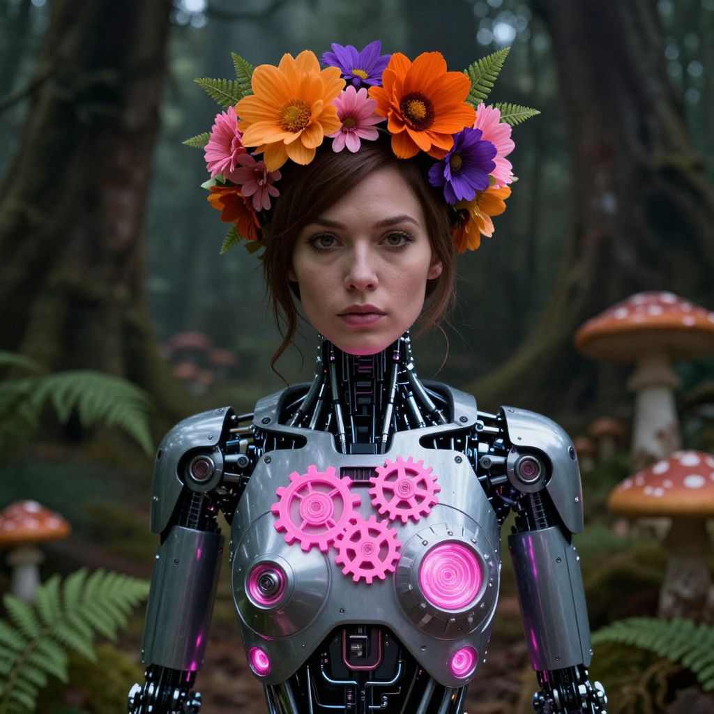 Digital artwork of a female robot with metallic silver body, glowing pink gears, and vibrant flower crown, set in a mystical forest with mushrooms.
