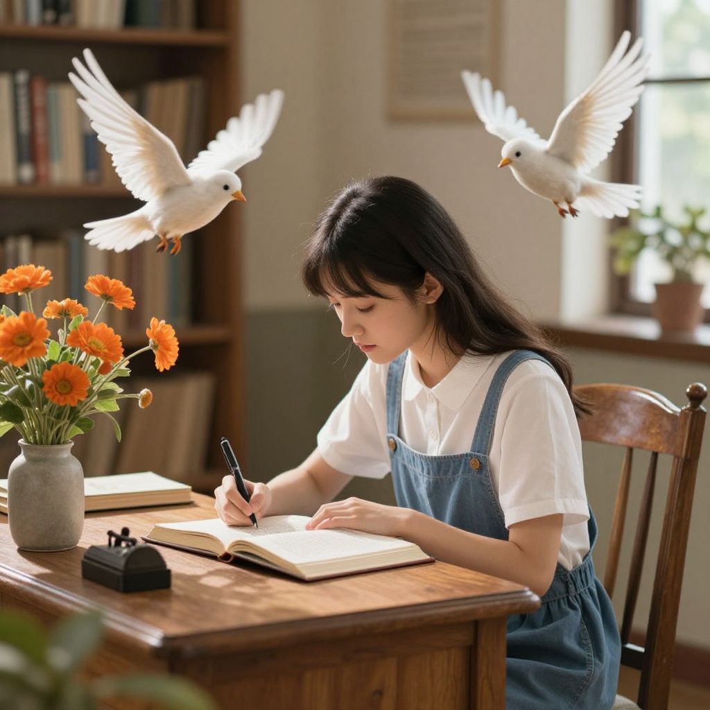 In a serene library setting bathed in soft natural light, a young woman in a white shirt and blue overalls sits at a wooden desk, engrossed in writing notes from an open book, as vibrant orange flowers and a whimsical white bird take flight near her, evoking a magical, dreamlike atmosphere reminiscent of fantasy illustration.