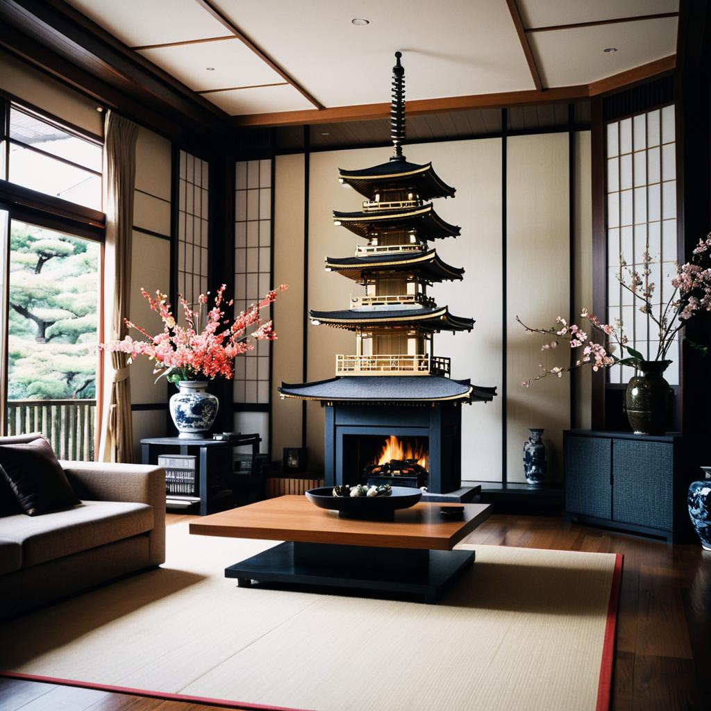 A traditional Japanese tea setting featuring a steaming black teapot and matching cup placed on a bamboo tray. Delicate cherry blossom branches extend gracefully above, illuminated by soft morning light filtering through a shoji screen in the background. The scene evokes tranquility and refined elegance, with detailed textures and expertly balanced colors.