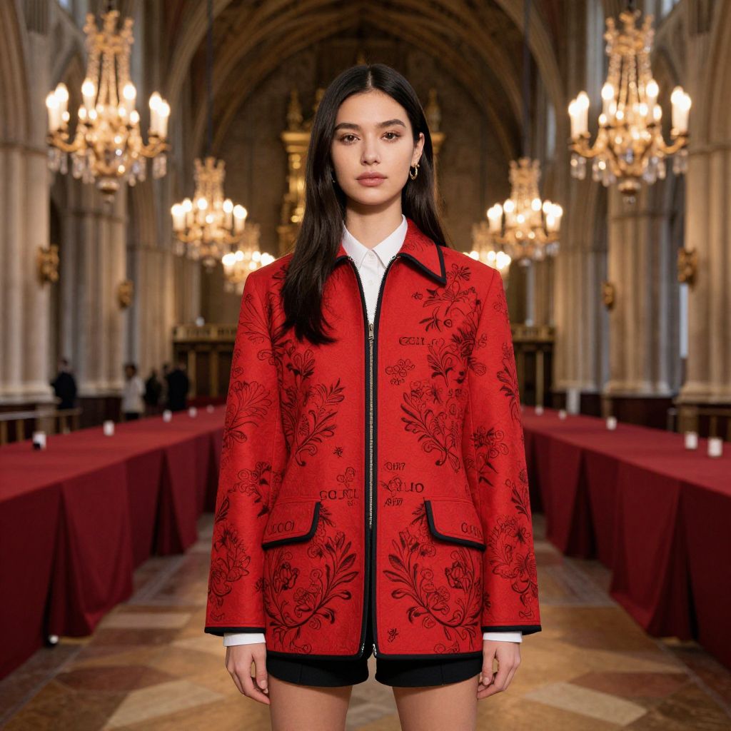 Elegant woman wearing a vibrant red Gucci Resort 2017 floral-patterned jacket by Alessandro Michele stands poised in a grand hall adorned with chandeliers and red-draped tables, evoking the opulence of Westminster Abbey's historic ambiance.