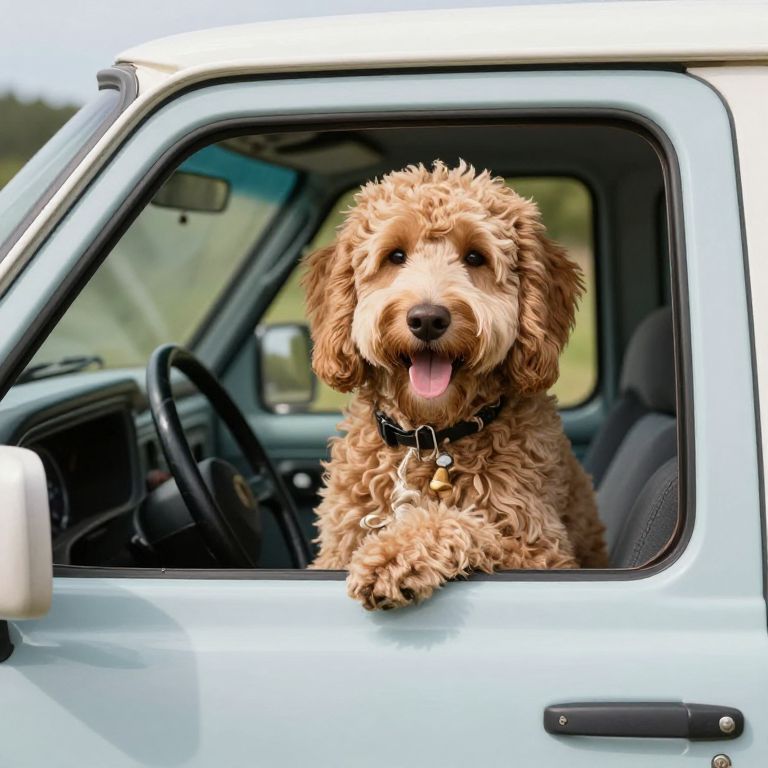 Golden Doodle Puppy Driving Pickup