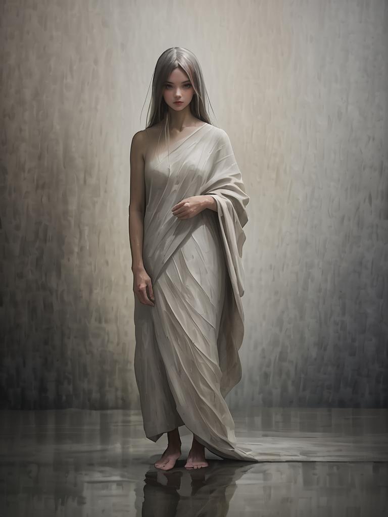 A tall, slender woman stands barefoot, wrapped elegantly in a flowing beige cloth. The image is rendered in an impressionist style with loose brushstrokes, featuring a neutral beige and gray color palette. The moody, contemplative atmosphere is enhanced by soft, diffused lighting and an abstract textured background.