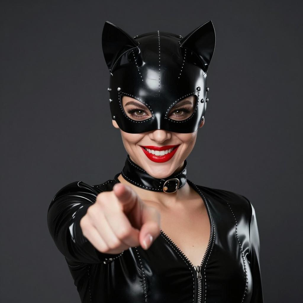Woman in black latex cat mask and suit with pointed ears, red lipstick, and white stitching. She points forward with right hand, smiling intensely. Dark background. Photo.