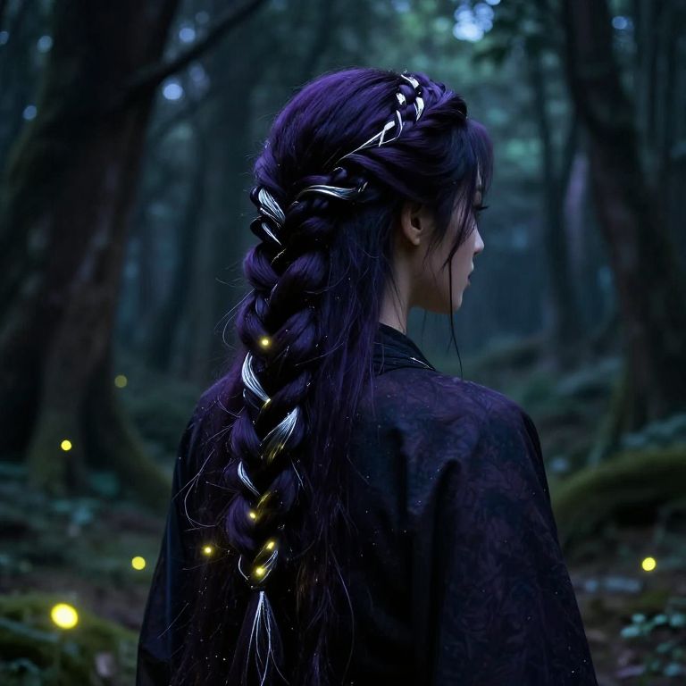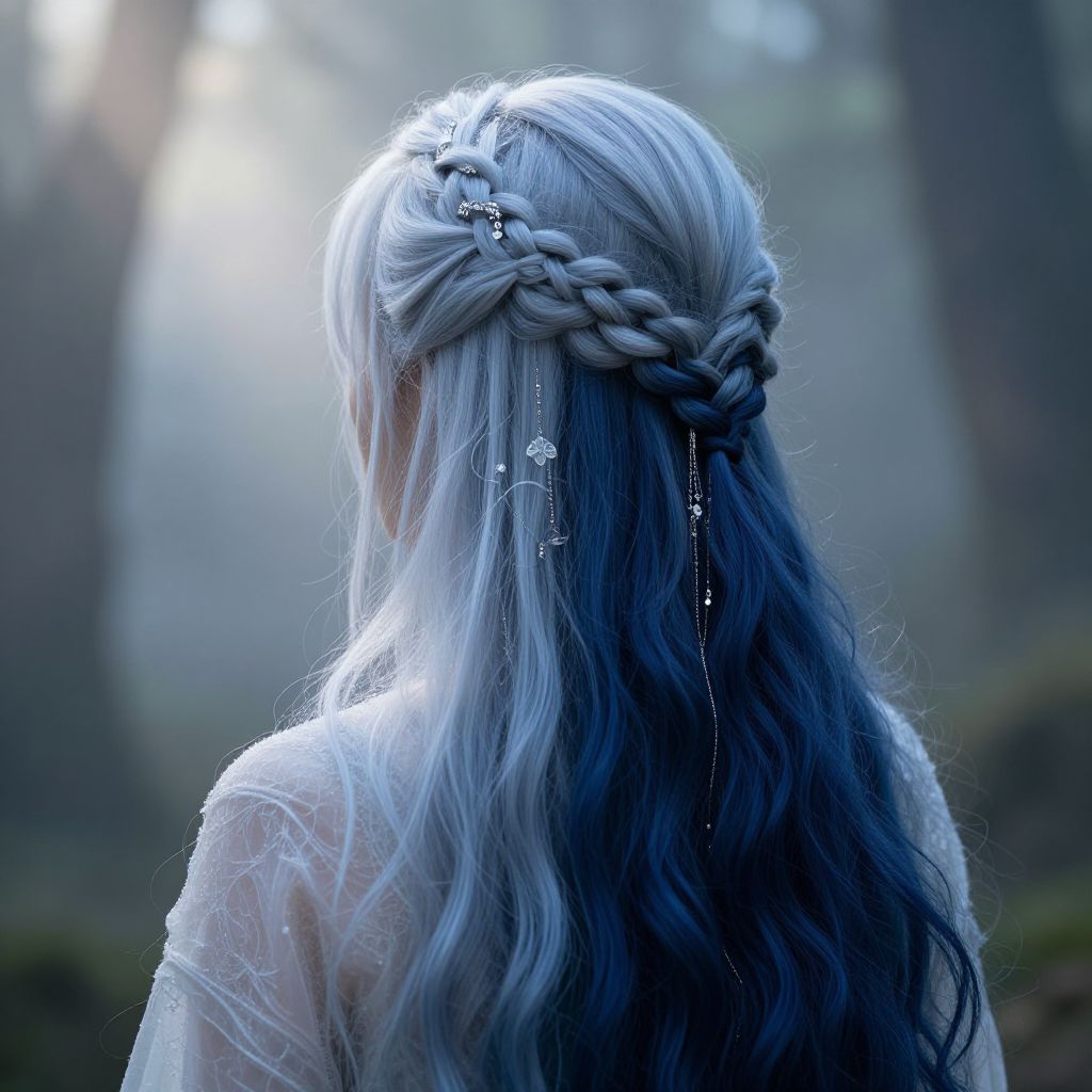 Hair color picture with a fantasy theme, showing hair shifting from icy silver to deep midnight blue, styled elegantly with intricate braids and delicate accessories, set in a mystical forest environment shrouded in fog and soft light beams, highly detailed.