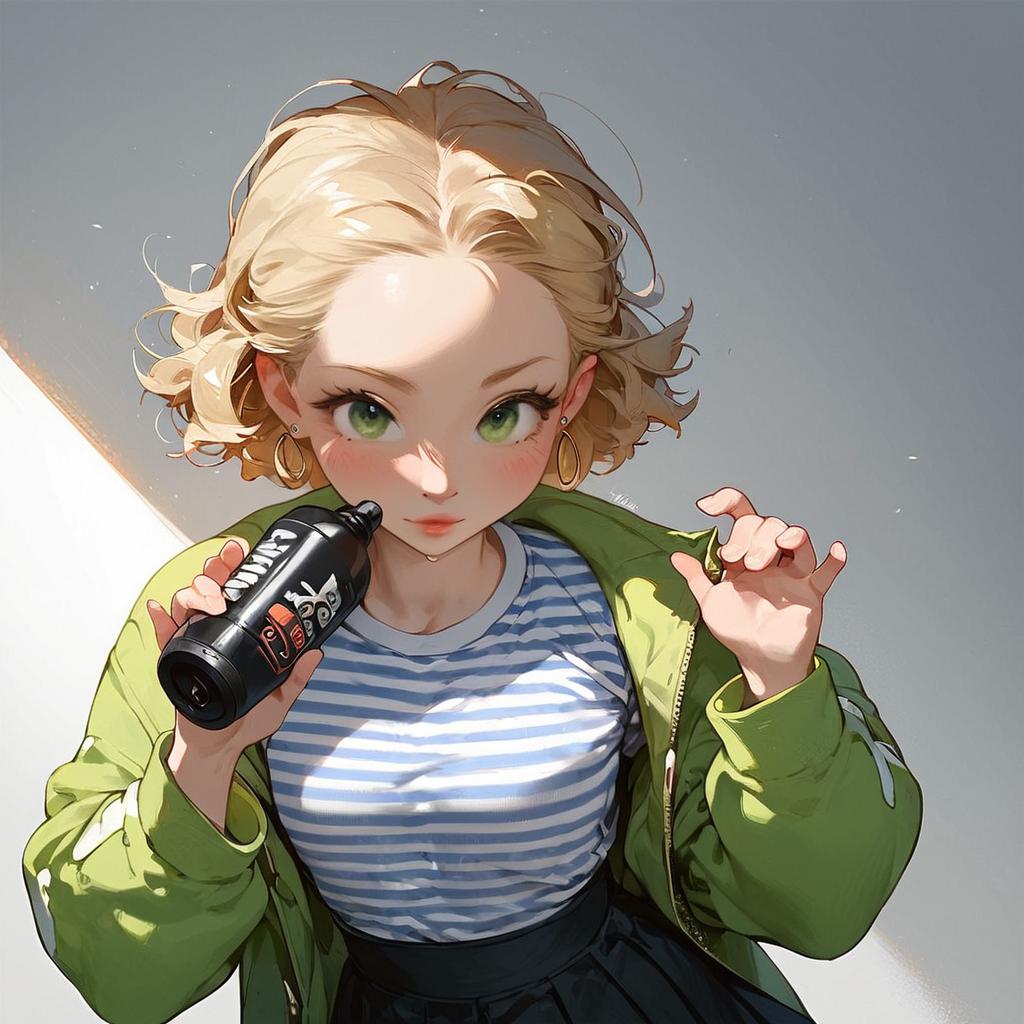 Score_9, score_8_up, score_7_up, score_6_up, score_5_up, score_4_up, source_anime, 1girl, solo, minnie may hopkins, short female, blonde hair, green eyes, flat chest, short hair, open jacket, striped shirt, pantyhose, skirt, portrait, grenade, holding grenade, grenade pin, pulling the pin from a grenade