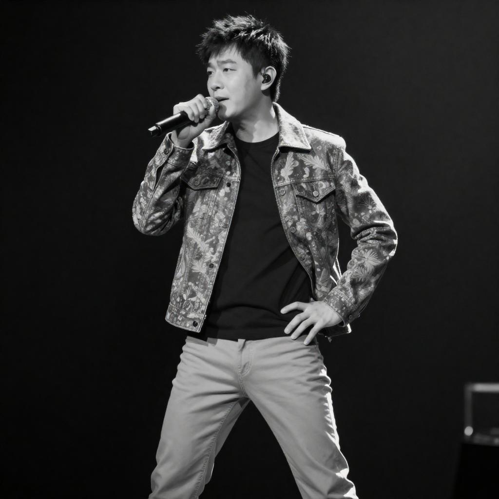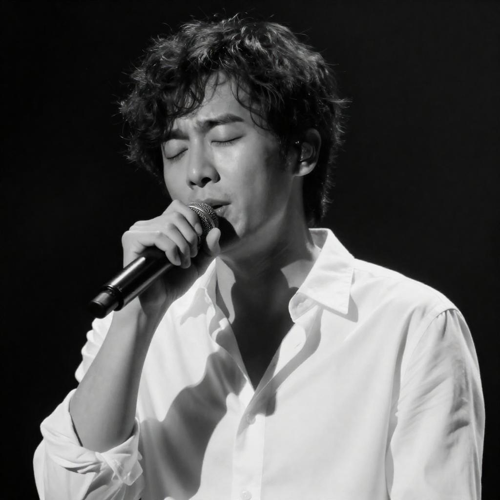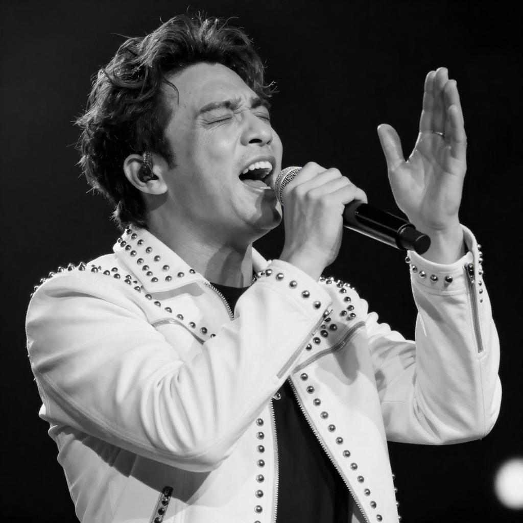 Photograph of a male singer with dark hair, wearing a pink shirt and black pants, passionately singing into a microphone on stage. He stands in the center with arms outstretched. Behind him, three musicians play guitars and a drum set against a blue curtain with star patterns. The stage is dimly lit, highlighting the singer.