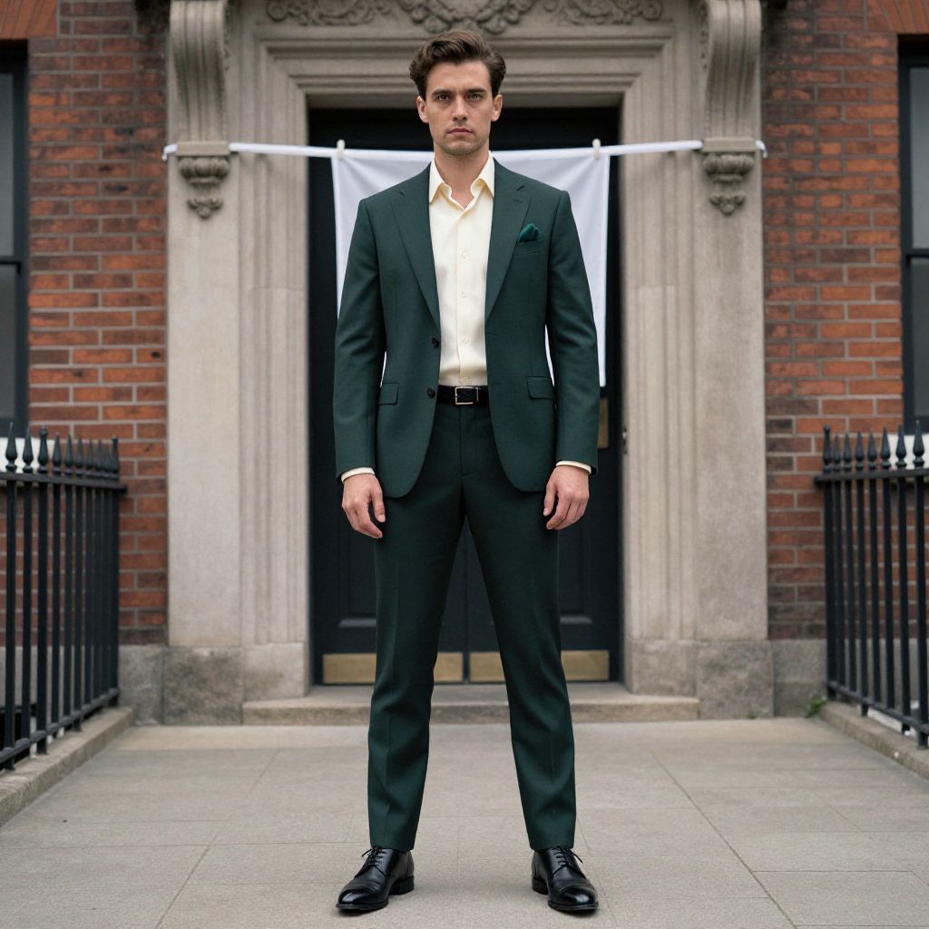 Photograph of a tall, handsome Caucasian man with short brown hair standing confidently in front of a brick building with ornate stone detailing. He wears a dark green suit, white dress shirt, black tie, and black leather shoes. A white sheet is draped over a clothesline behind him, contrasting with the dark door and brick walls. He stands with his hands relaxed at his sides, exuding a formal, elegant demeanor. The image is sharply focused, highlighting the textures of his suit and the building's architecture.