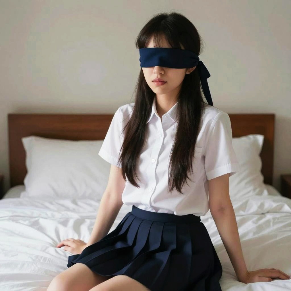 A young Asian woman wearing a white short-sleeve button-up shirt and a navy blue pleated skirt sits on a bed with white bedding, supporting herself with her arms. She has long dark hair and is blindfolded with a navy blue cloth. The bedroom has a minimalistic setting with a wooden headboard.