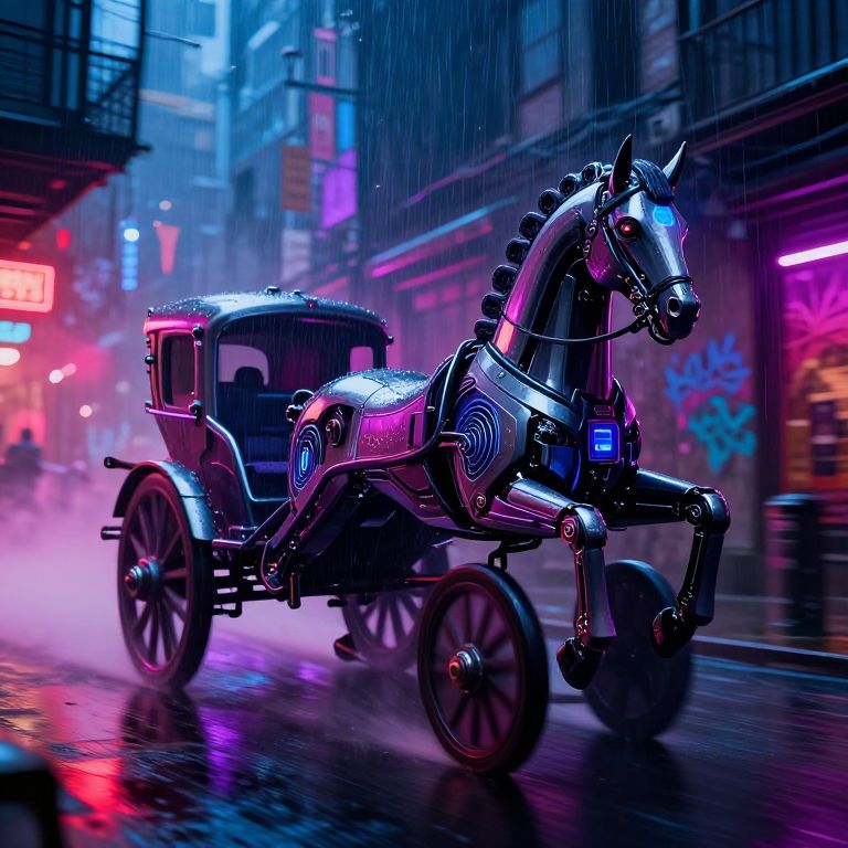 Futuristic cyberpunk renaissance punk vehicle speeding through a neon-lit velvet-draped alley, sleek cybernetic horse design fused with classical chariots, glowing graffiti, raindrops reflecting vibrant lights, dynamic motion blur, atmospheric haze
