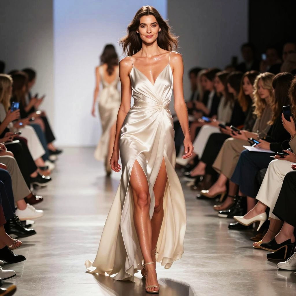 Photograph of a runway fashion show featuring a slender, pale-skinned woman with short, dark brown hair adorned with a white flower crown. She wears an off-the-shoulder, white lace bridal gown with long sleeves and a high slit on the left, exposing her left leg. The dress is embellished with intricate lace flowers. She walks on a black runway scattered with pink and white flower petals. The background is dark, with blurred spectators seated on both sides, some taking photos. The overall aesthetic is ethereal and romantic.