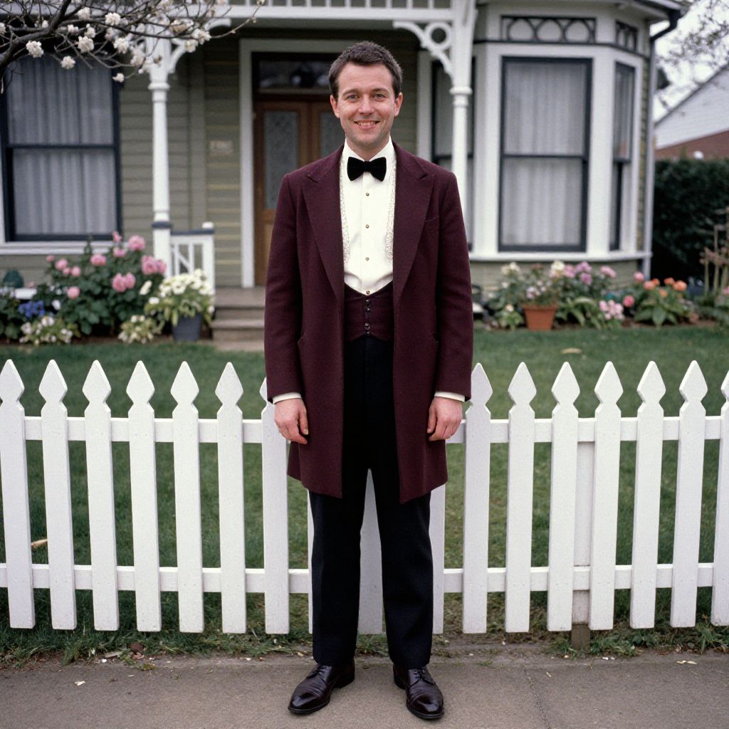 A man, deep burgundy tailcoat, cream wingtip collar shirt, black velvet bow tie, black dress trousers, dark brown leather derby shoes, charming Victorian house, blooming garden, white picket fence, anscochrome analog film, confident smile. Man has masculine face and piercing eyes