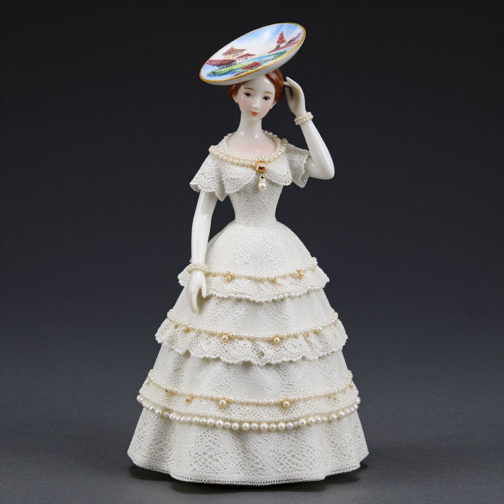 Exquisite porcelain figurine of a young woman wearing a four-tiered lace dress, adorned with delicate pearl embellishments, and a picture hat featuring a painted landscape scene, stands gracefully against a dark background.