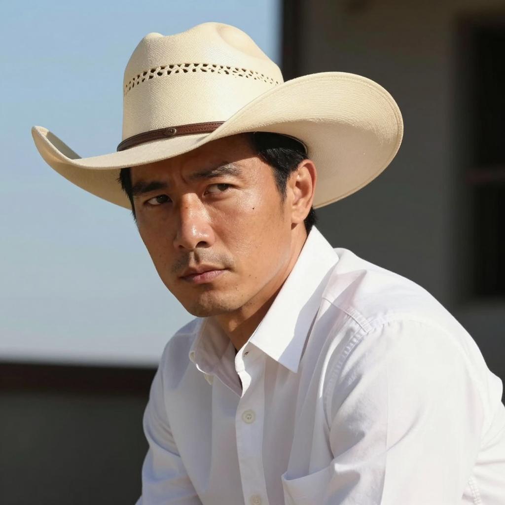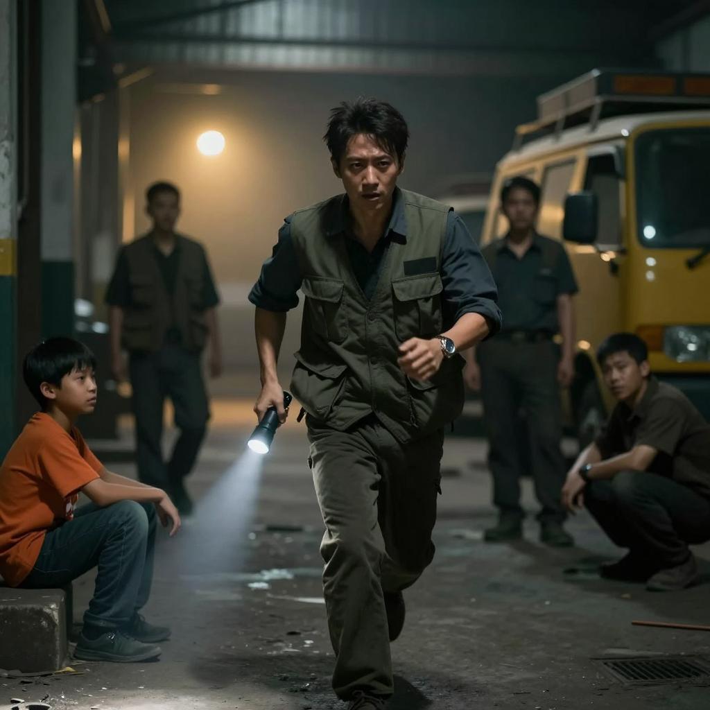 Close-up photograph of an Asian man with short dark hair, intensely aiming a black pistol near his right eye. He wears a brown jacket over a black shirt. The background is blurred, showing studio lights and equipment. A black umbrella is partially visible behind his head. The man's right index finger points upward as he focuses on his target.
