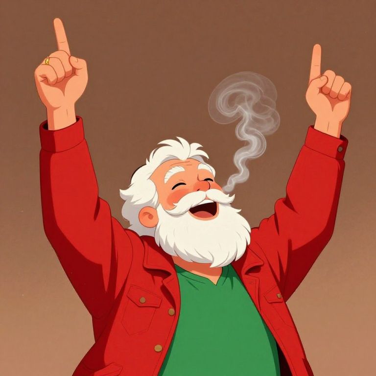 In this vibrant illustration, a joyous figure exudes an aura of elation, his body language radiating pure bliss. His right arm is raised high, fingers splayed in a gesture of triumph, while his left hand points upwards, as if reaching for the heavens. The man's face is a mask of delight, his eyes closed in pure contentment, and a wispy trail of smoke curls from his mouth, adding to the sense of euphoria. He is dressed in a red jacket over a green shirt, the colors contrasting vividly against the warm, earthy background. The man's beard, white and full, frames his face, and a gold ring adorns his finger, catching the light. The overall composition is dynamic, with the figure's arms and hands creating a sense of movement and energy, encapsulating the essence of the joyous moment.