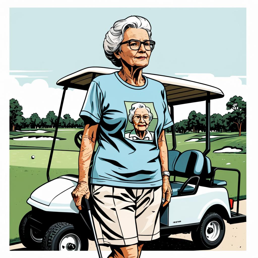 Realistic photo.Illustrated T-shirt design of elderly woman standing near a golf cart at a golf course, comic style, vector, solid white background, muted color palette.