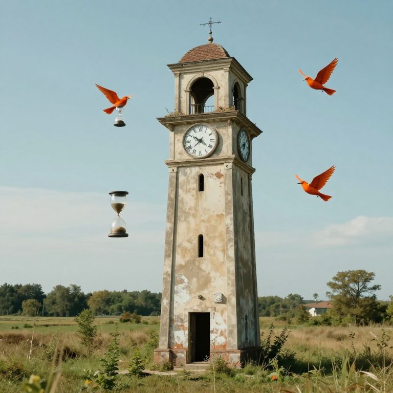 Abandoned clock tower stands tall amidst a serene landscape, its weathered facade adorned with four floating hourglasses held by vibrant orange timebirds, symbolizing the passage and manipulation of time within a picturesque setting.