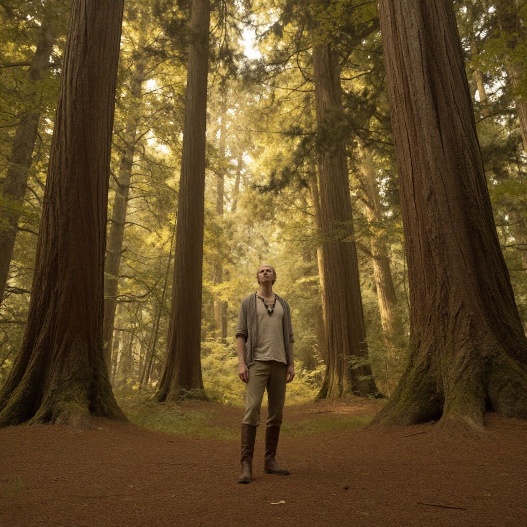 A photograph of a man standing in a serene redwood forest. He has a medium build, light skin, and short brown hair. He wears a beige shirt, brown pants, and knee-high brown boots, with a brown necklace. Tall, towering redwood trees with textured bark surround him, bathed in warm, golden sunlight filtering through the dense foliage. The forest floor is covered in brown pine needles. The man stands slightly off-center, looking directly at the camera with a calm expression. The background showcases a dense, sunlit forest with a mix of light and shadow.