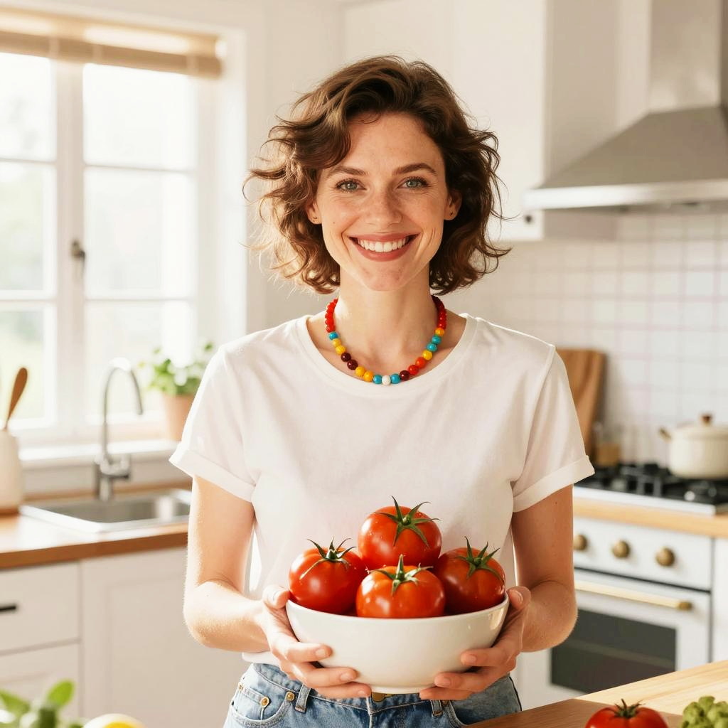 A cheerful woman stands in a bright, sunlit kitchen, holding a bowl of fresh tomatoes. The watercolor style captures her vibrant smile, accented by a colorful necklace, evoking a sense of warmth and hospitality within a home setting.