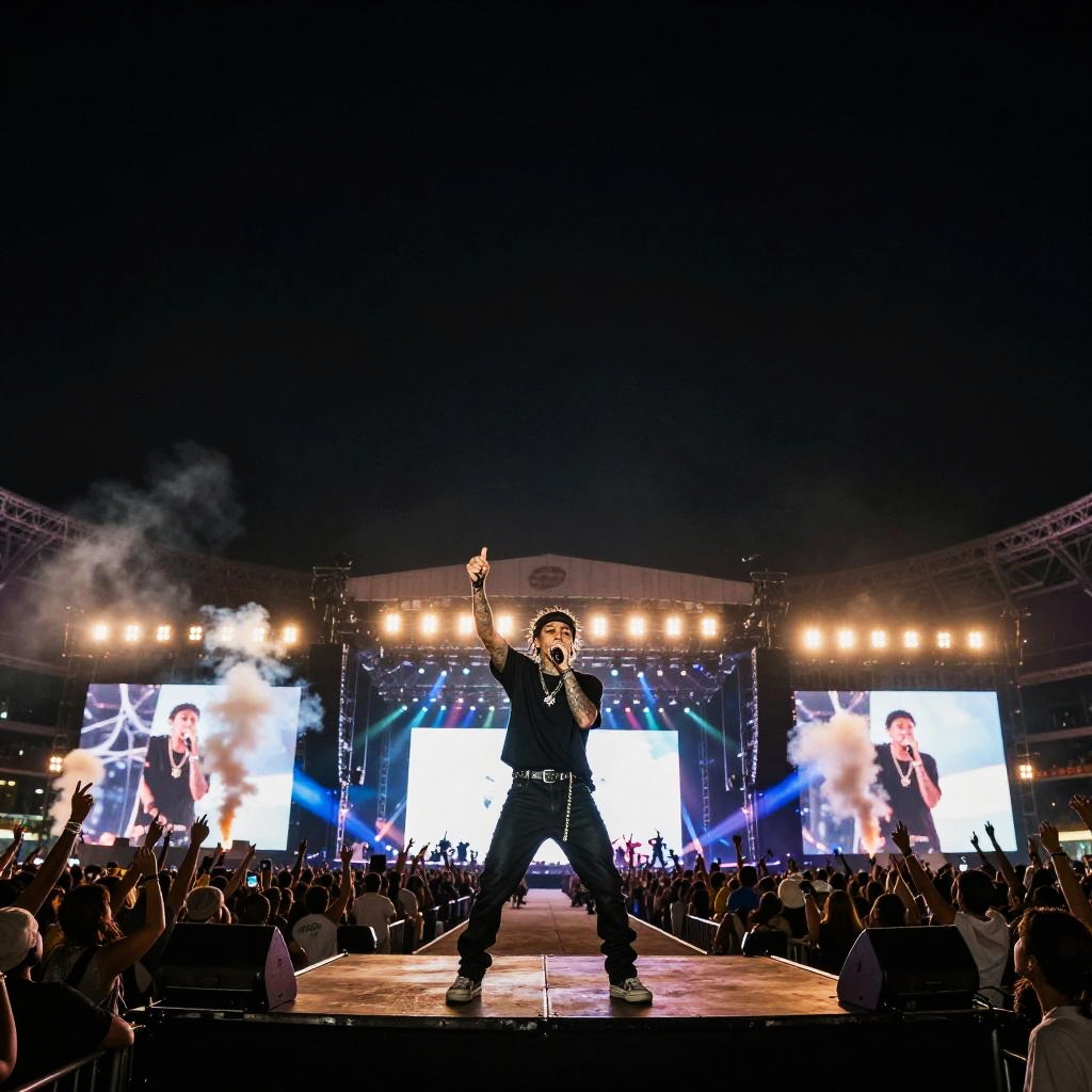 Xxxtentacion alive performing on a massive stage under a starry night sky, crowd cheering, colorful spotlights and smoke effects, energetic and emotional atmosphere