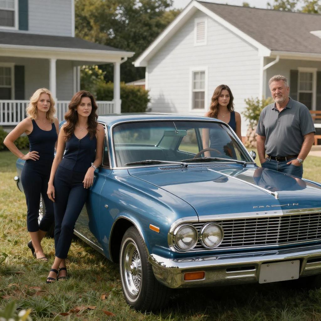 Photograph of five people standing around a shiny blue vintage car in a sunlit suburban yard. Three women in dark clothing lean against the car, while two men in casual attire stand nearby. The background includes a white porch and greenery. The car's chrome details and classic design are prominent.