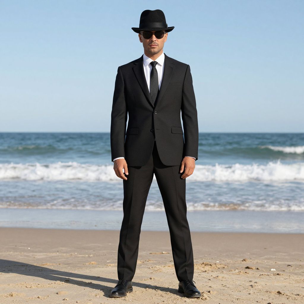 Photograph of a man standing on a sandy beach with the ocean and clear blue sky in the background. He is dressed in a black suit with a white dress shirt and black tie, complemented by a black fedora hat and black sunglasses. His hands hang by his sides, and he is wearing black dress shoes. The waves in the ocean are white-capped, and the sand beneath him is light-colored. The man's expression is neutral, and he casts a shadow on the sand. The overall scene has a mysterious, noir-like atmosphere.