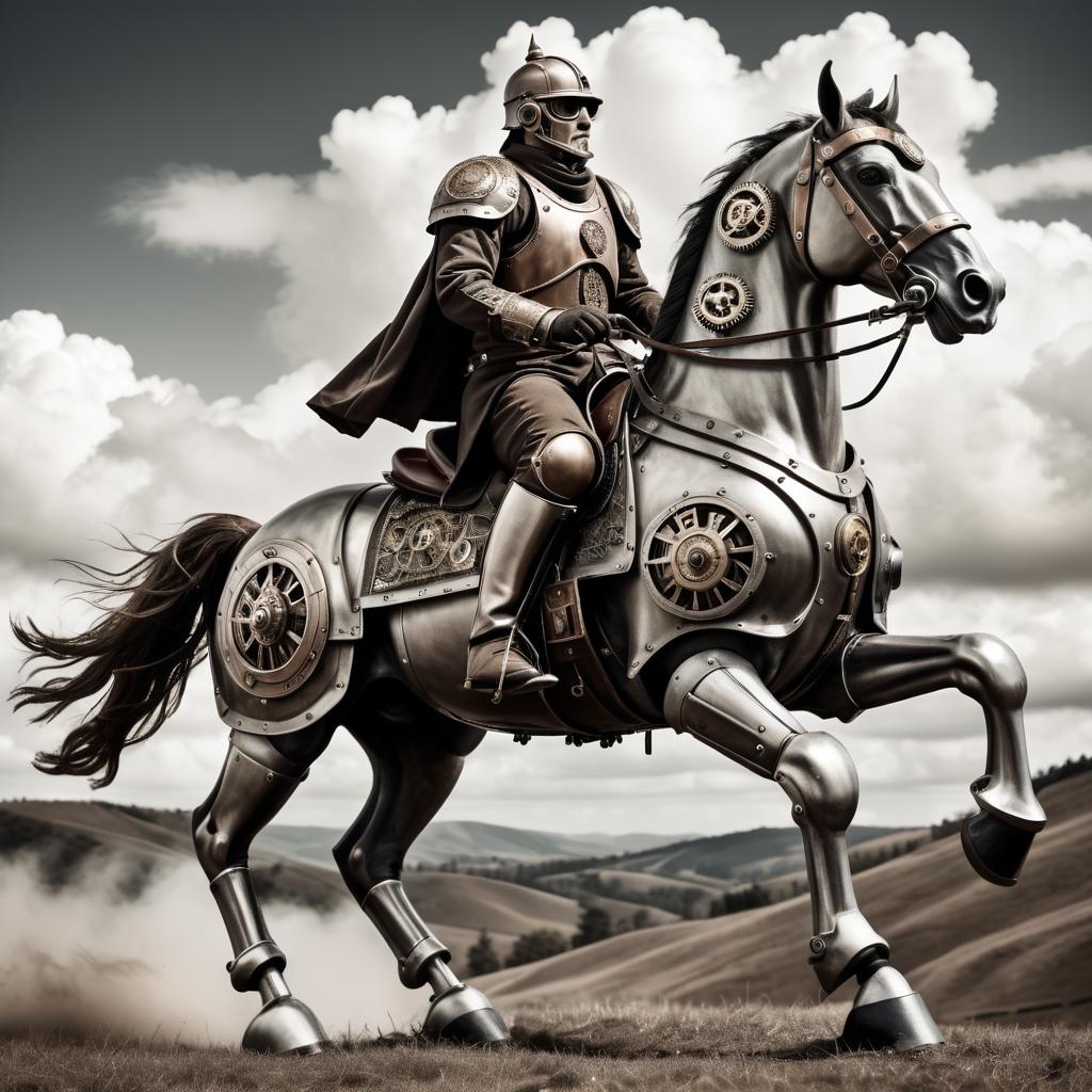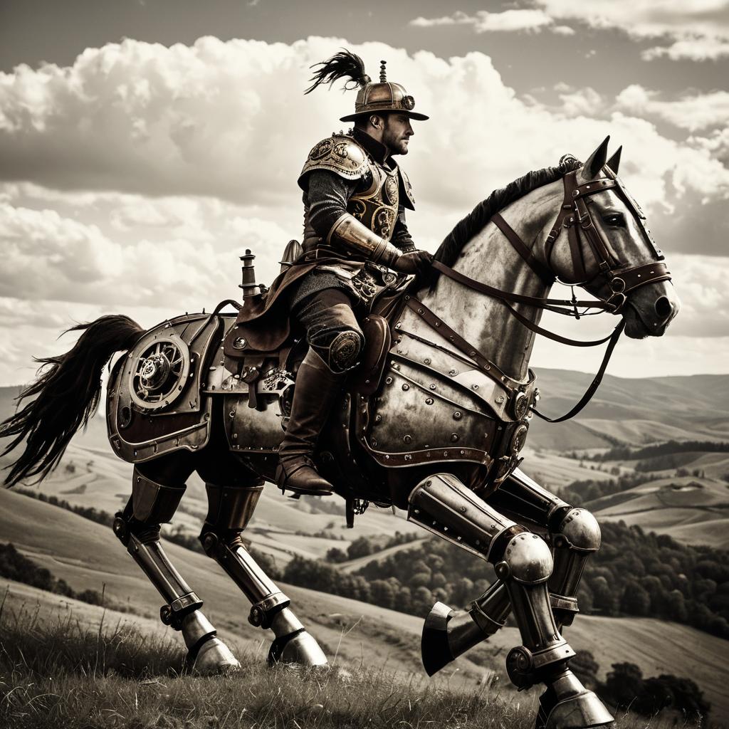 A man in detailed steampunk armor riding a mechanical horse, realistic vintage engraving style, monochrome sepia tone with dark brown and beige colors, background with rolling hills and cloudy sky, medieval and fantasy fusion setting