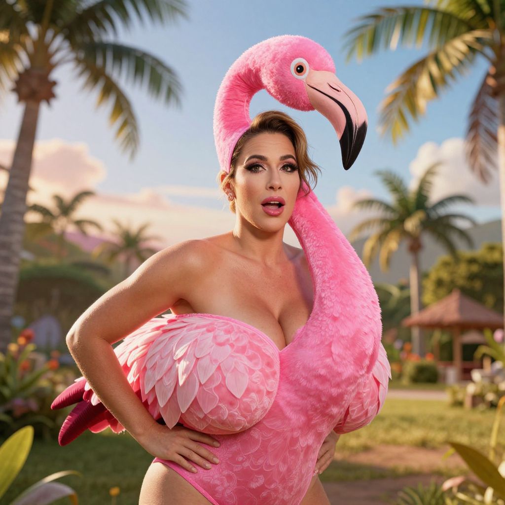 Photorealistic CGI of a curvy woman with large breasts wearing a pink flamingo onesie and headpiece, standing in a tropical garden with palm