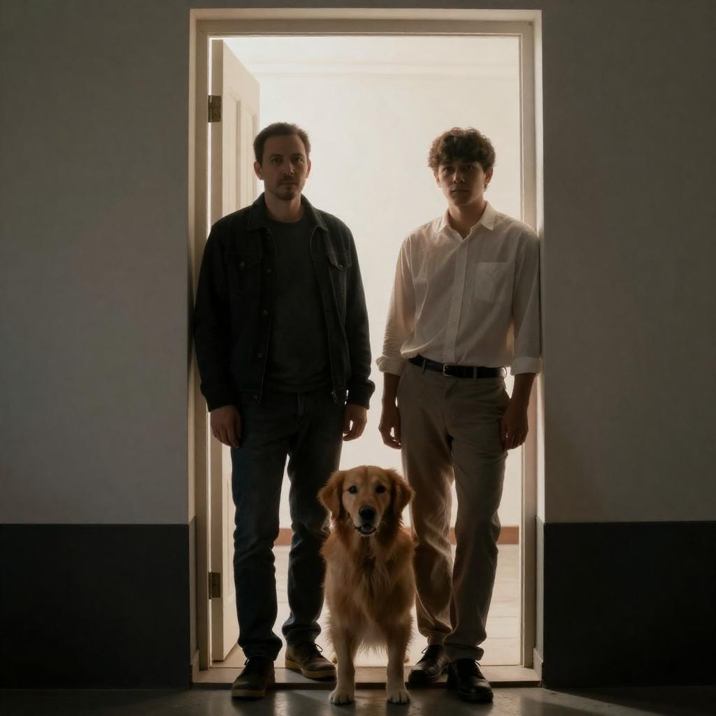 Photograph of a dimly lit, red-lit room with vertical neon lights. Four men, silhouetted in red, stand and kneel in the center. One man on the left walks towards them, while the others form a semi-circle. Modern, minimalistic furniture is visible in the background.