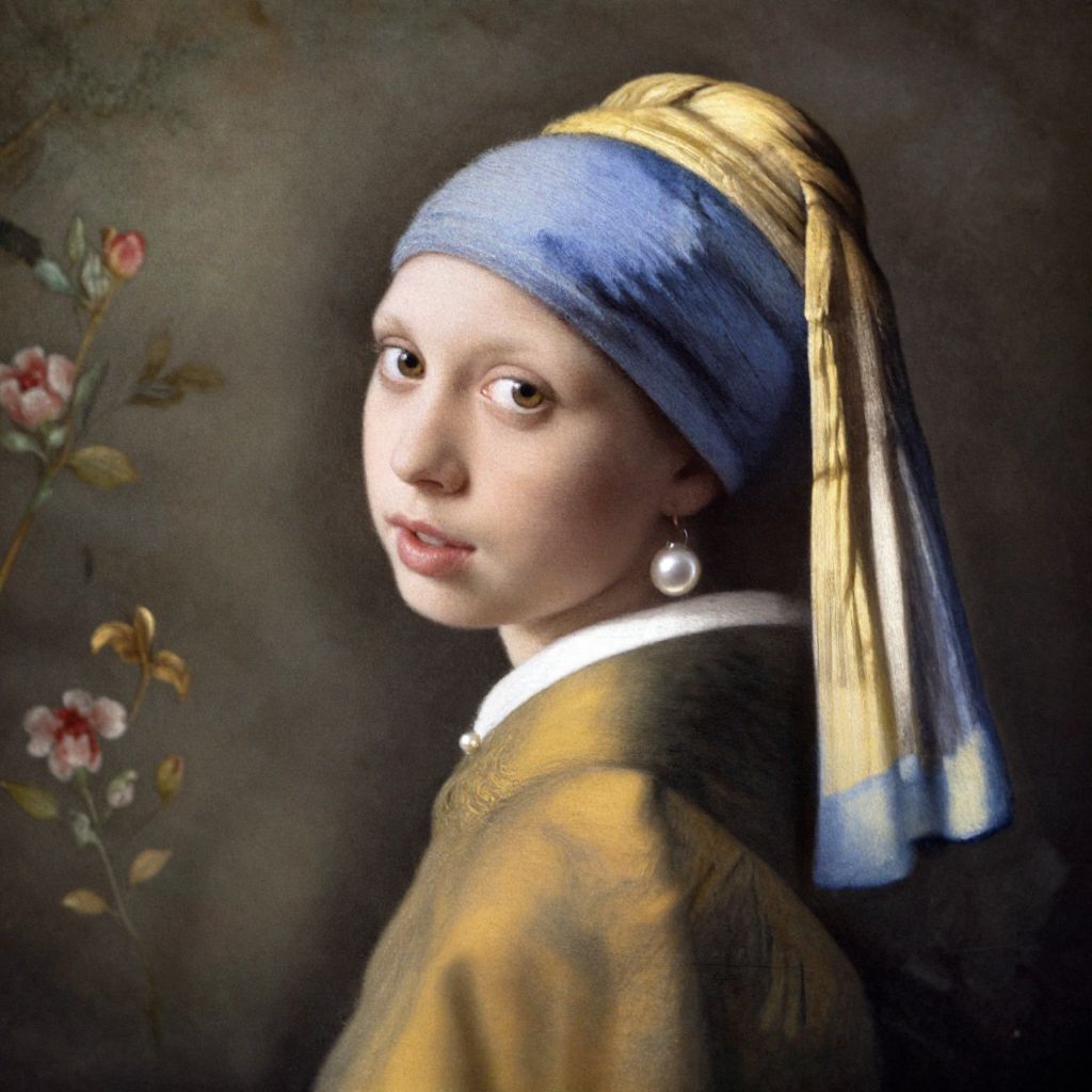 Photorealistic digital artwork of a young woman with pale skin, blue and yellow headscarf, pearl earring, floral background, classic Dutch portrait