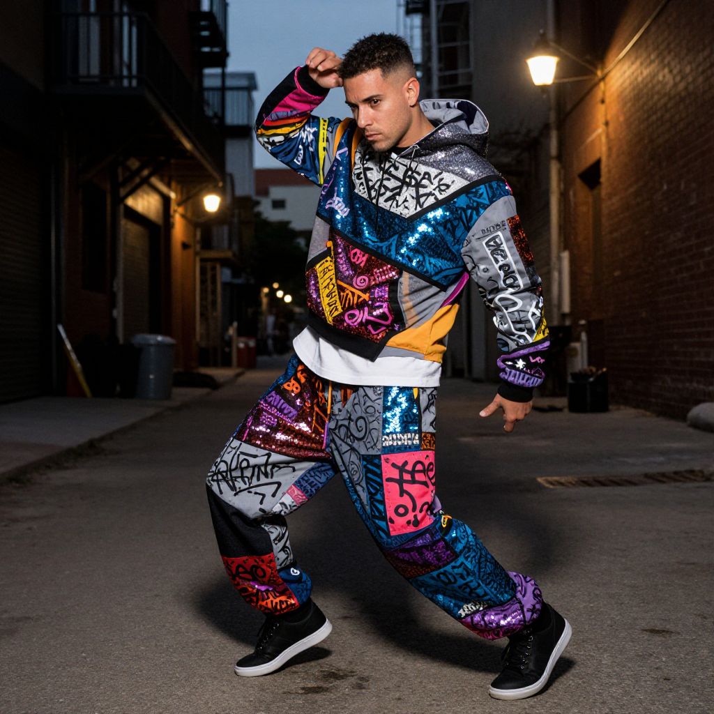 A realistic photography shot of a modern hip hop dance costume featuring layered fabrics, sequins, and bold graffiti patterns, worn by a diverse man with light skin, short black hair, and a serious, focused face, mid-move during a dance routine in a gritty urban city alley with street lights flickering in the background.