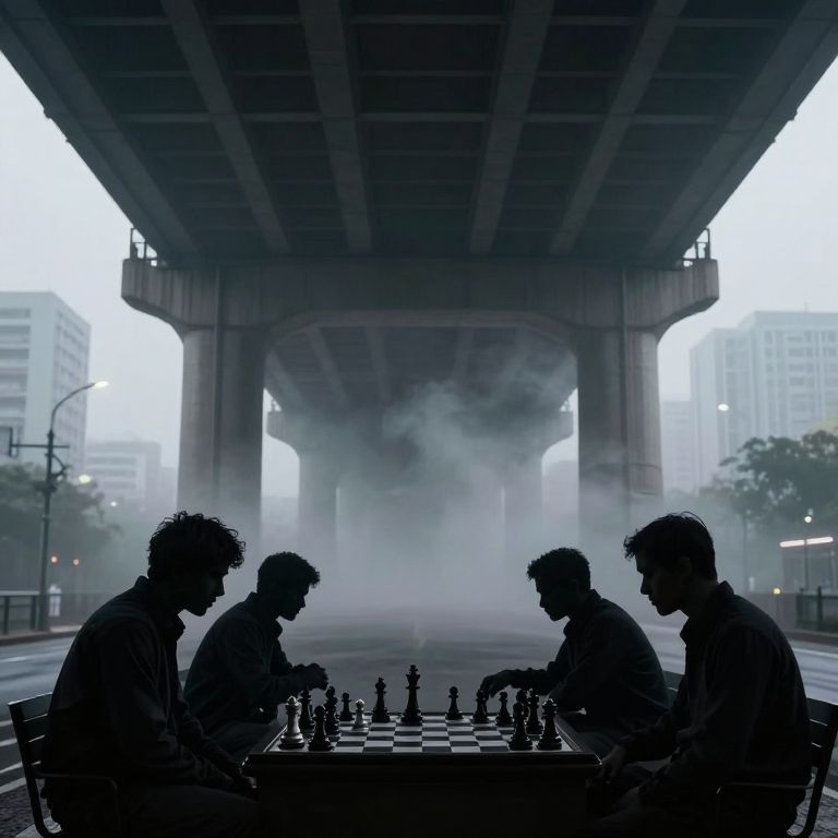 Six silhouetted figures engage in a tense chess match beneath a towering overpass, surrounded by misty urban structures and faint streetlights, as smoke drifts ominously around them.