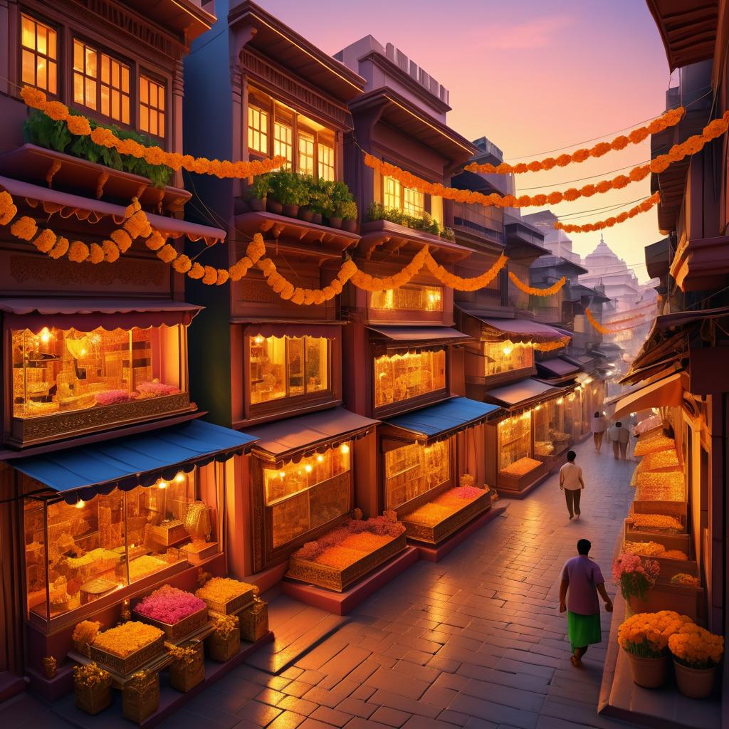 Isometric low-angle shot, at evening, on a lively Indian market street featuring a charming old-style jewelry shop with ornate displays, decorated with marigold garlands. The sunset sky is ablaze, creating a romantic, slightly sensual ambiance.
