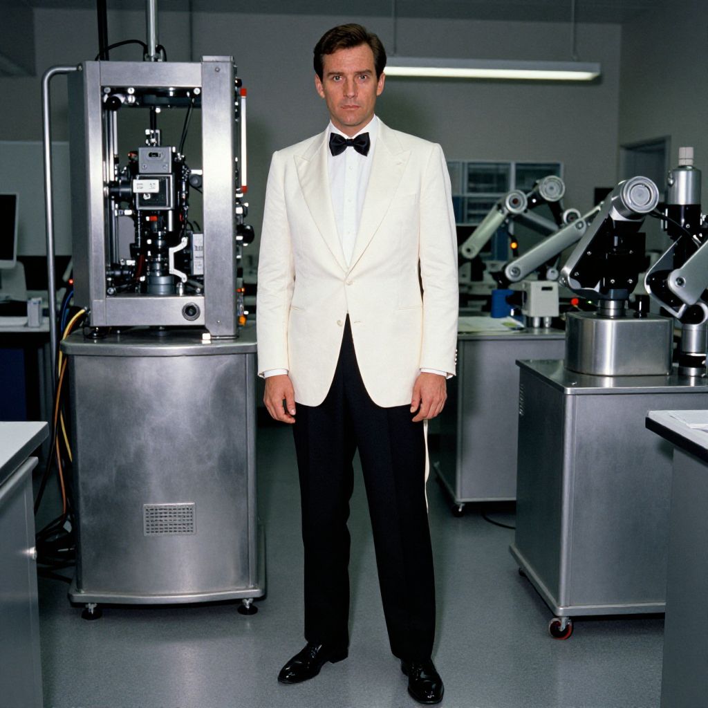 Photograph of a Caucasian man with short brown hair, standing in a modern laboratory. He wears a white tuxedo jacket with black lapels, black bow tie, and black pants. His black dress shoes are polished. The laboratory has a metallic, industrial feel with various silver equipment, including robotic arms and control panels, in the background. The room is brightly lit with fluorescent lights, and the floor is a smooth, light gray texture. The man's expression is neutral, and he stands centered, facing the camera.