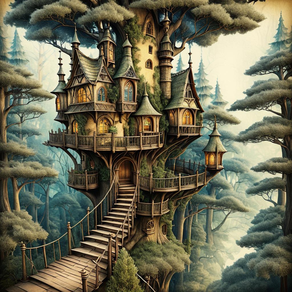 Anton Pieck style illustration of a medieval fantasy treehouse in the trees, bird's eye view, in the forest, vintage paper texture, intricate line work, high detail, mystical atmosphere, warm and nostalgic tones, soft lighting, high quality, magical artifacts, nostalgic, warm tones, soft lighting