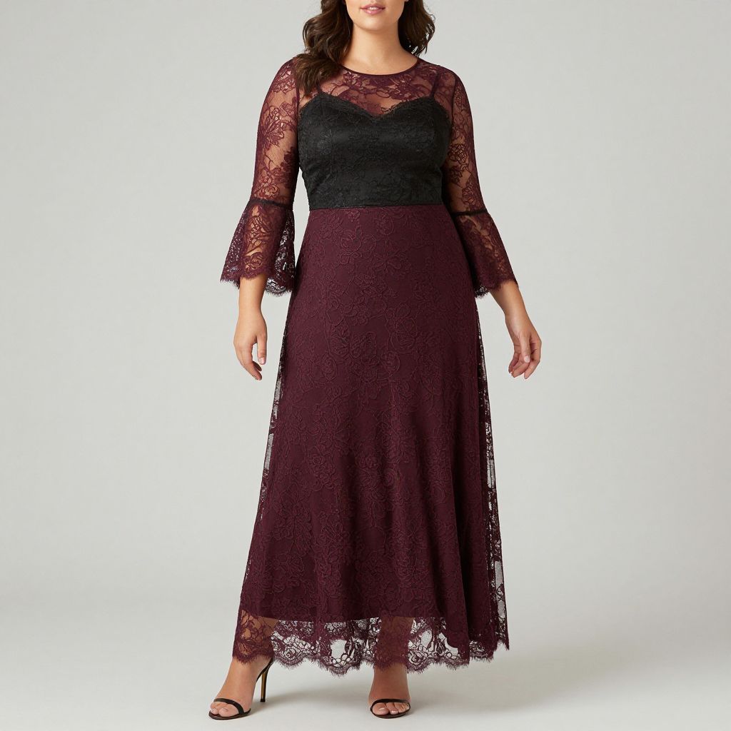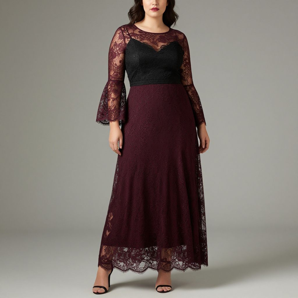 Plus-size woman modeling a burgundy laced gown featuring a sheer lace overlay with bell sleeves, paired with a black lace bodice and skirt, complemented by open-toe heels.