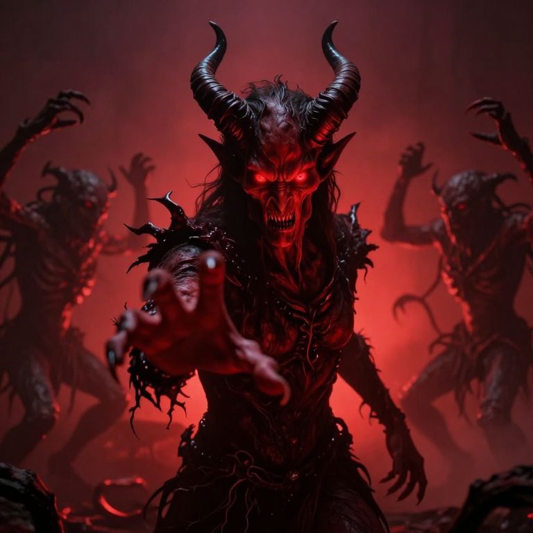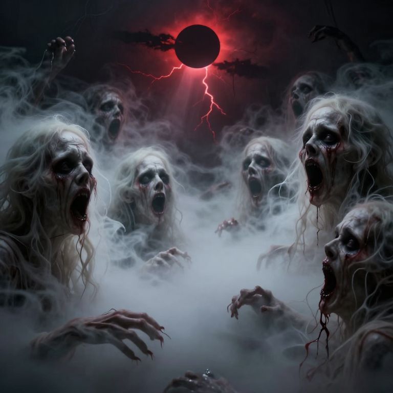 Photorealistic digital art: Fierce, topless woman with wild hair, smoking, screaming, surrounded by dark, ghostly hands, red and