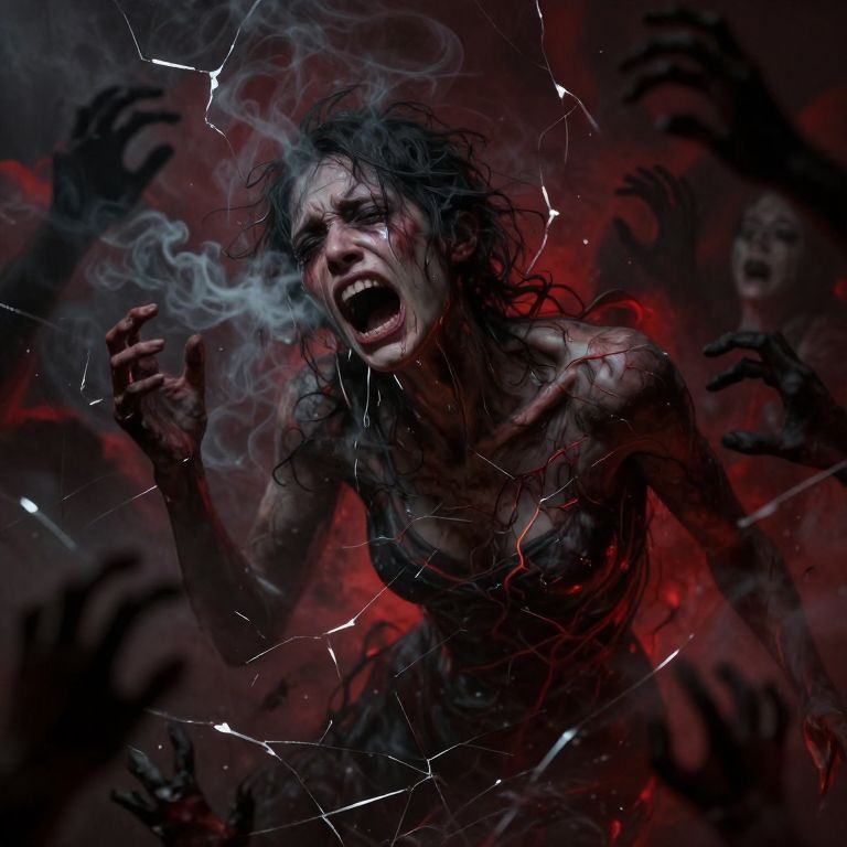 An extremely detailed and emotional artistic visualization of agony and anguish, The central figure, abstract yet human-like, is twisted and contorted, their face frozen in a silent scream, with tears blending into streaks of smoke or ash, The background is a chaotic swirl of dark, muted colors—deep reds, blacks, and greys—interspersed with jagged, broken-glass-like lines, Shadowy, grasping hands and blurred faces emerge faintly from the darkness, symbolizing overwhelming inner turmoil, Subtle cracks run through the figure's form, with faintly glowing veins of light adding depth and symbolic tension to the scene