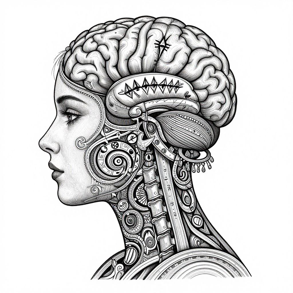 A highly detailed, intricate black and white drawing of a woman's head and neck, adorned with elaborate patterns and symbols, depicting the brain and spinal cord in a symbolic and meaningful style.
