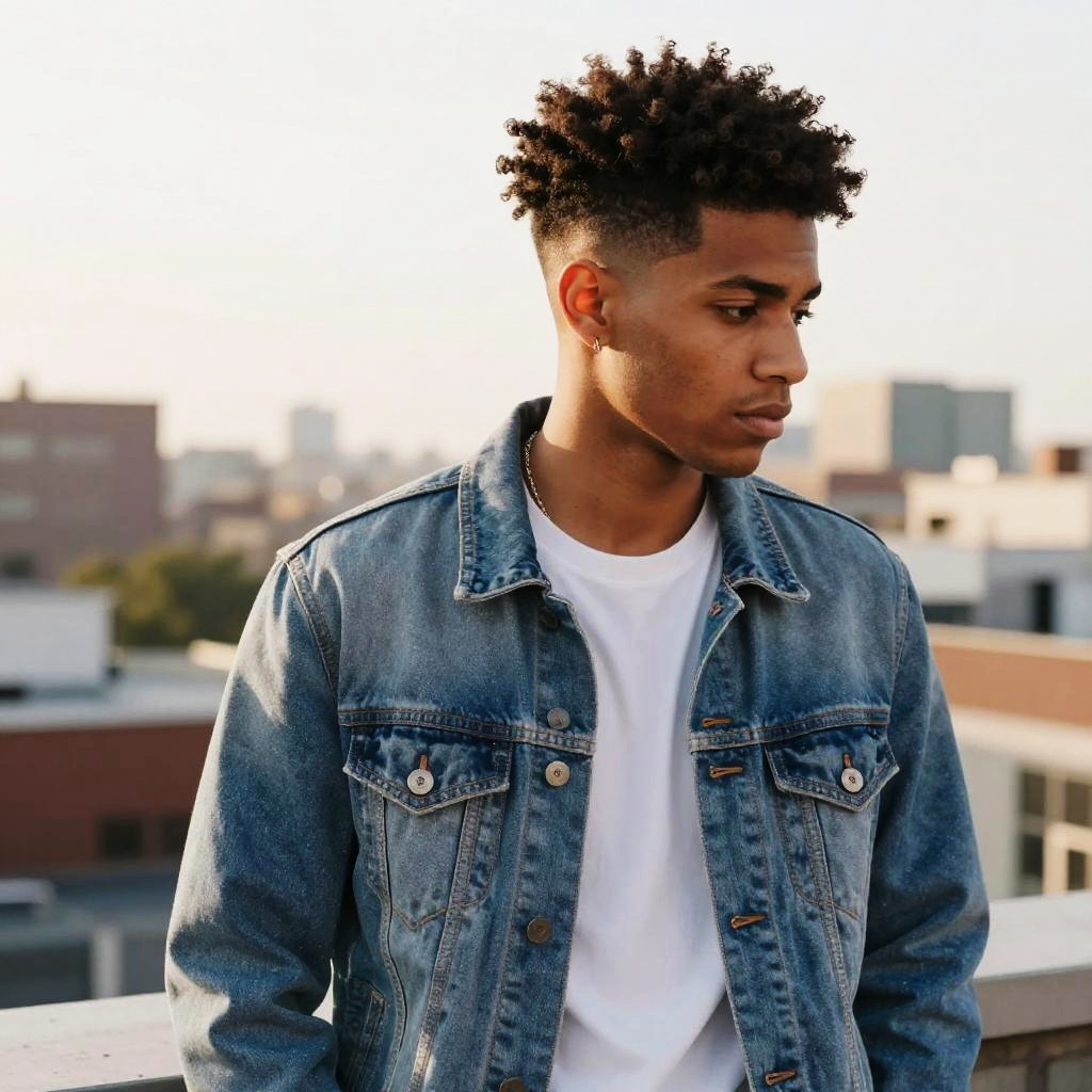 Drop Fade Afro hairstyle on male, wearing denim jacket with white t-shirt, in city rooftop, captured in fashion editorial style with soft golden hour light.