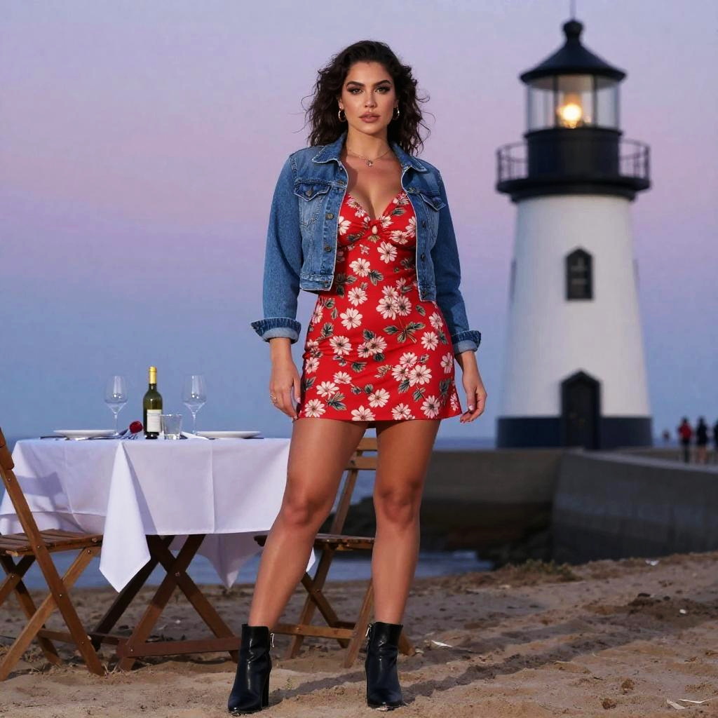 A busty woman in casual streetwear, wearing a red floral mini dress with a denim duster jacket and black ankle boots, stands at a Dusk Beach Dinner near a Lighthouse, surrounded by soft twilight hues. The visual style is reminiscent of Studio Pierrot, capturing the serene atmosphere and vibrant colors of the scene. Sexy. Pretty face and beutiful eyes