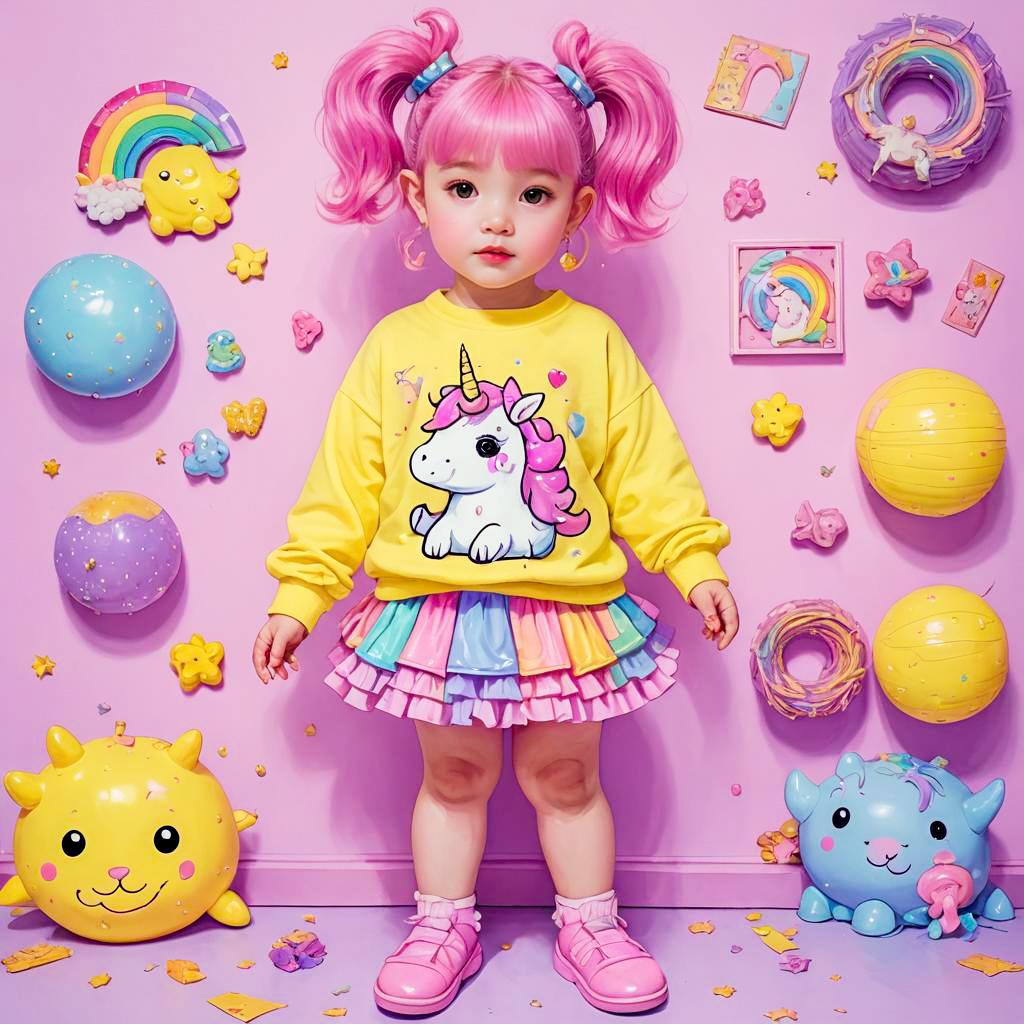 Child Chubby, Small Hands, Pigtails, Bright Pink pastel goth outfit, pastel yellow unicorn sweater with pink ruffled skirt and glittery sandals, oversized lavender graphic tee with rainbow shorts style, watercolor illustration, playful animation