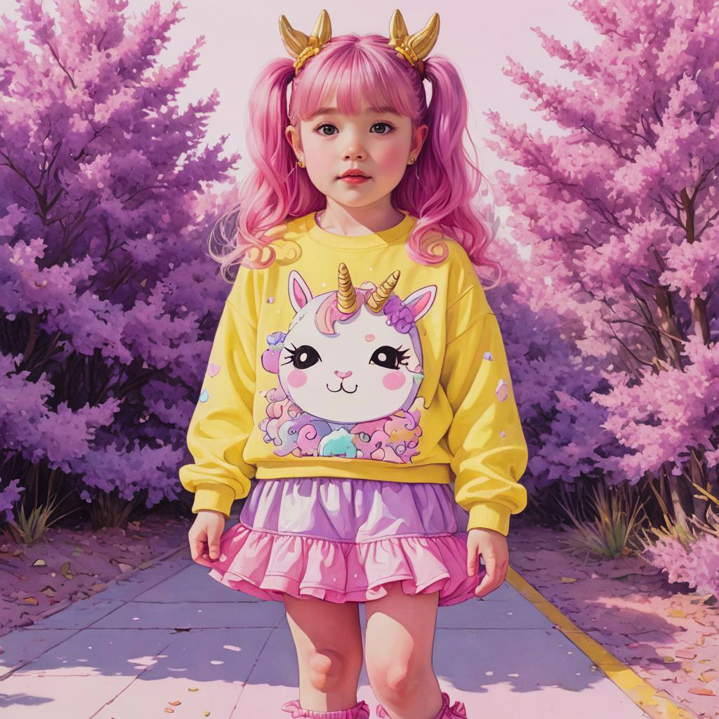 Portrait of a young child with chubby cheeks and small hands, styled with bright pink pigtails. She wears a pastel yellow oversized unicorn sweater paired with a pink ruffled skirt, standing on a path surrounded by vibrant purple foliage. The image is a colorful watercolor-style illustration with playful, pastel goth fashion elements.