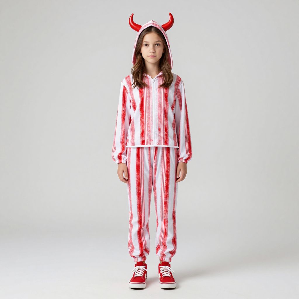 Girl candy cane costume, 1girl, solo, pants, hood, shoes, full body, standing, brown hair, looking at viewer, sneakers, horns, skirt, red footwear