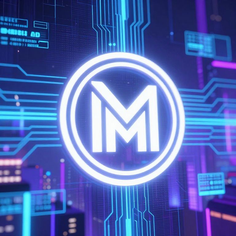 Mnhr emblem glowing softly on a futuristic digital interface, surrounded by holographic data streams, neon blue and purple tones, cyberpunk cityscape in the background, intricate circuit patterns, high detail, vibrant and dynamic lighting