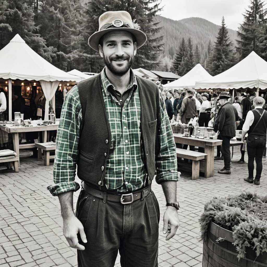 Photo of a Tall man, Messy Bun, Oktoberfest outfit, traditional Bavarian attire with Forest Green lederhosen made of Burlap, plaid shirt, knee-high socks, loafers, and an alpine hat, festive plaza, black and white grainy photo