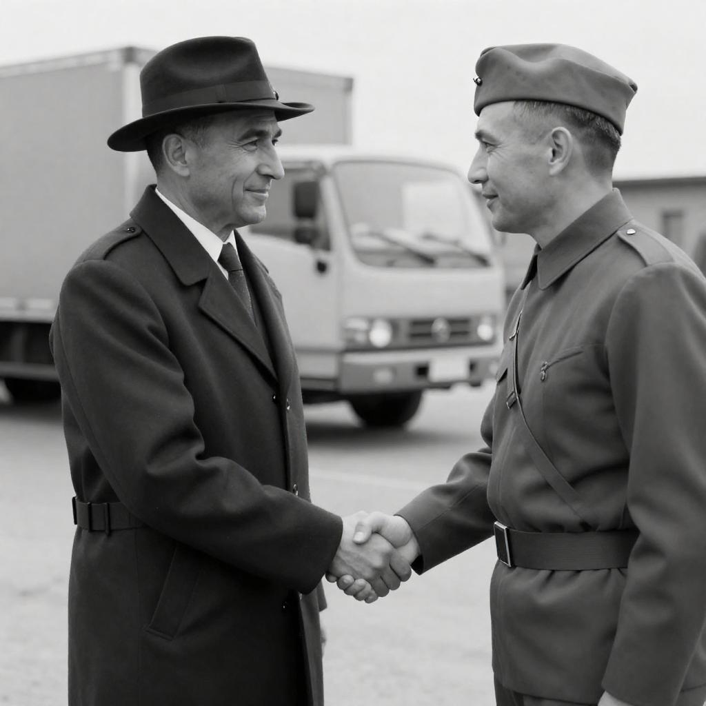 Black-and-white photograph of two men in vintage military uniforms. One man in a dark uniform with short, slicked-back hair shakes hands with a smiling man in a light trench coat and police hat, standing beside an open car door. Background includes a ured wall and foliage. Both men are engaged in a friendly exchange.