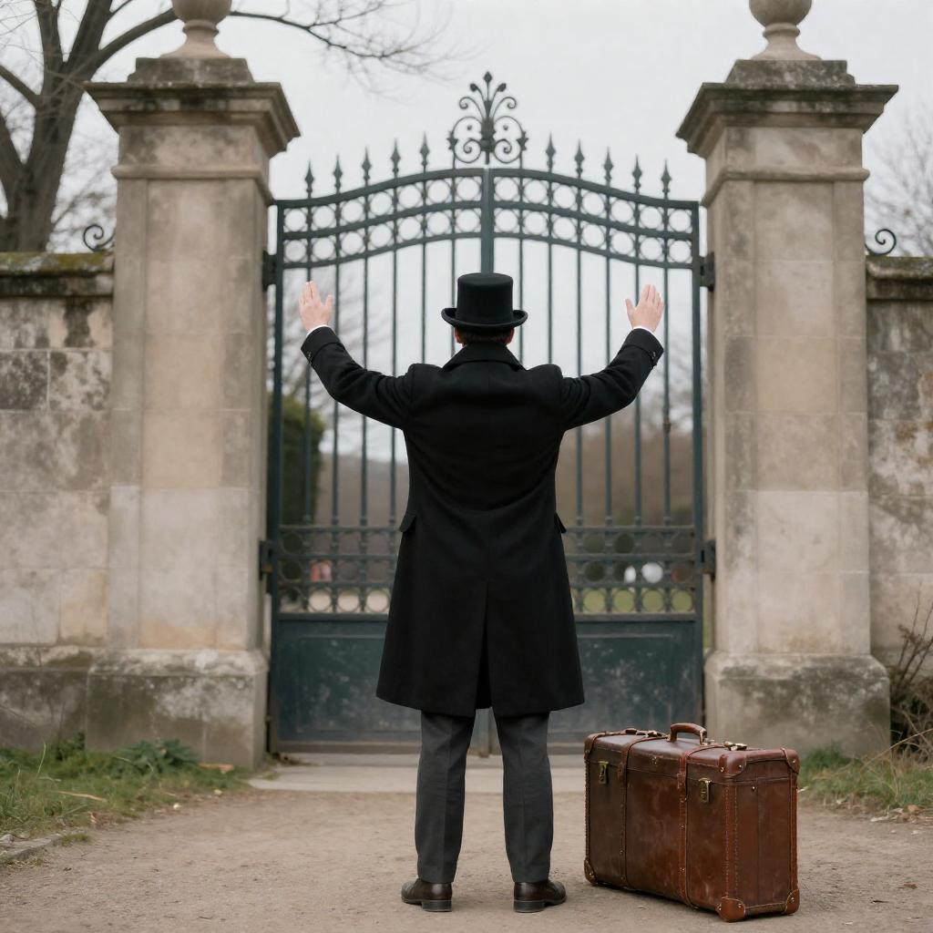 A photograph of a man in a long black coat and top hat, standing with arms raised, facing a large, ornate iron gate set in a stone wall. Two brown leather trunks are on the ground beside him. The ground is dusty with sparse grass and a leafless tree on the left.