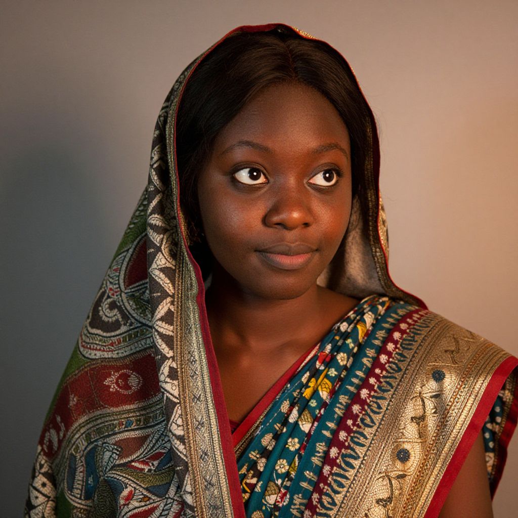 Photograph of a dark-skinned African woman with a medium build and round face, wearing a traditional, intricately patterned sari in shades of gold, red, blue, and green. The sari features detailed embroidery with floral and geometric designs. She has straight black hair, partially covered by the sari, and she gazes slightly to the right with a calm expression. The background is a simple, gradient grey to beige, highlighting her face and sari. The lighting is warm, casting soft shadows and emphasizing the textures of the fabric.